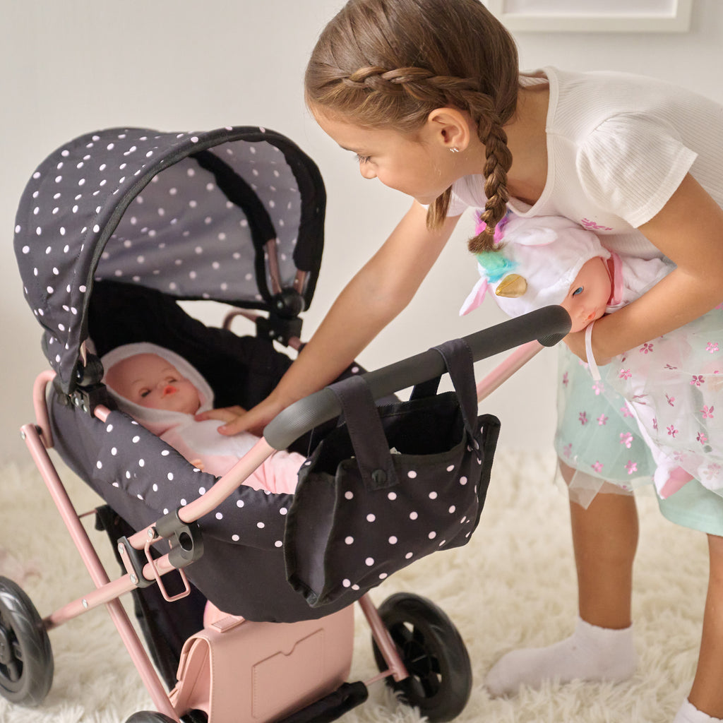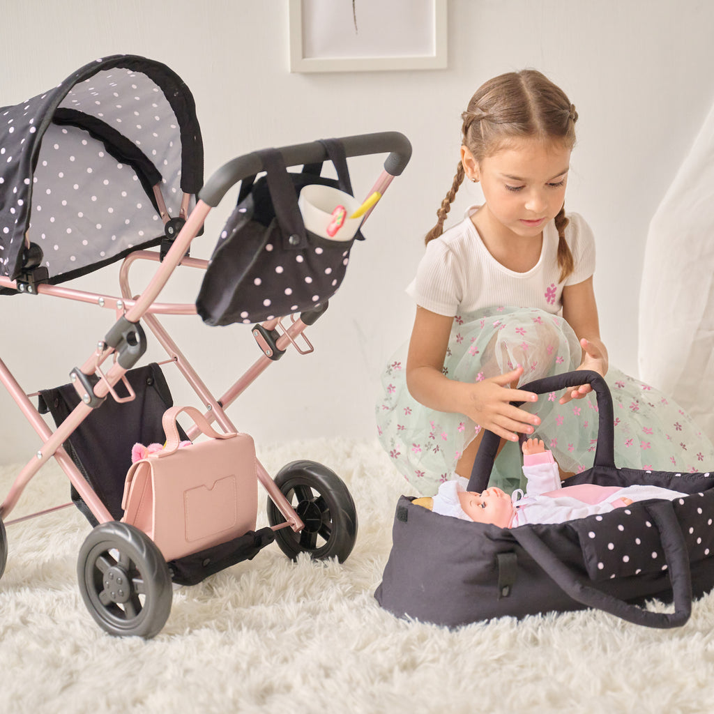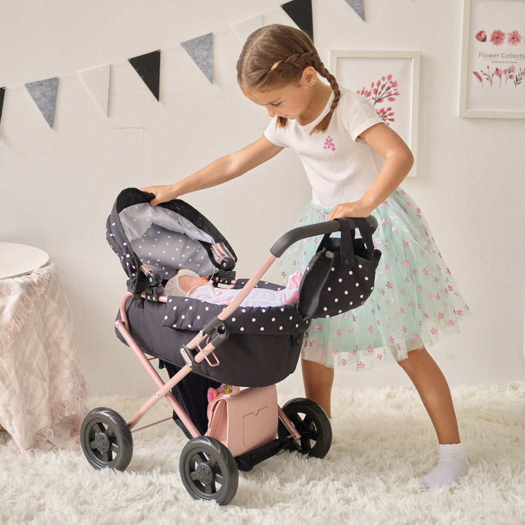 This 2-in-1 baby doll stroller provides more than just fun, since it supports emotional development, independence, and daily routines for toddlers and young kids. With a detachable bassinet and classic pram-style frame, children can care for their dolls in a realistic and engaging way that mirrors everyday activities. As they place their baby doll into the stroller, adjust the canopy, or gather items in the matching nursery bag, children practice empathy, responsibility, and coordination.