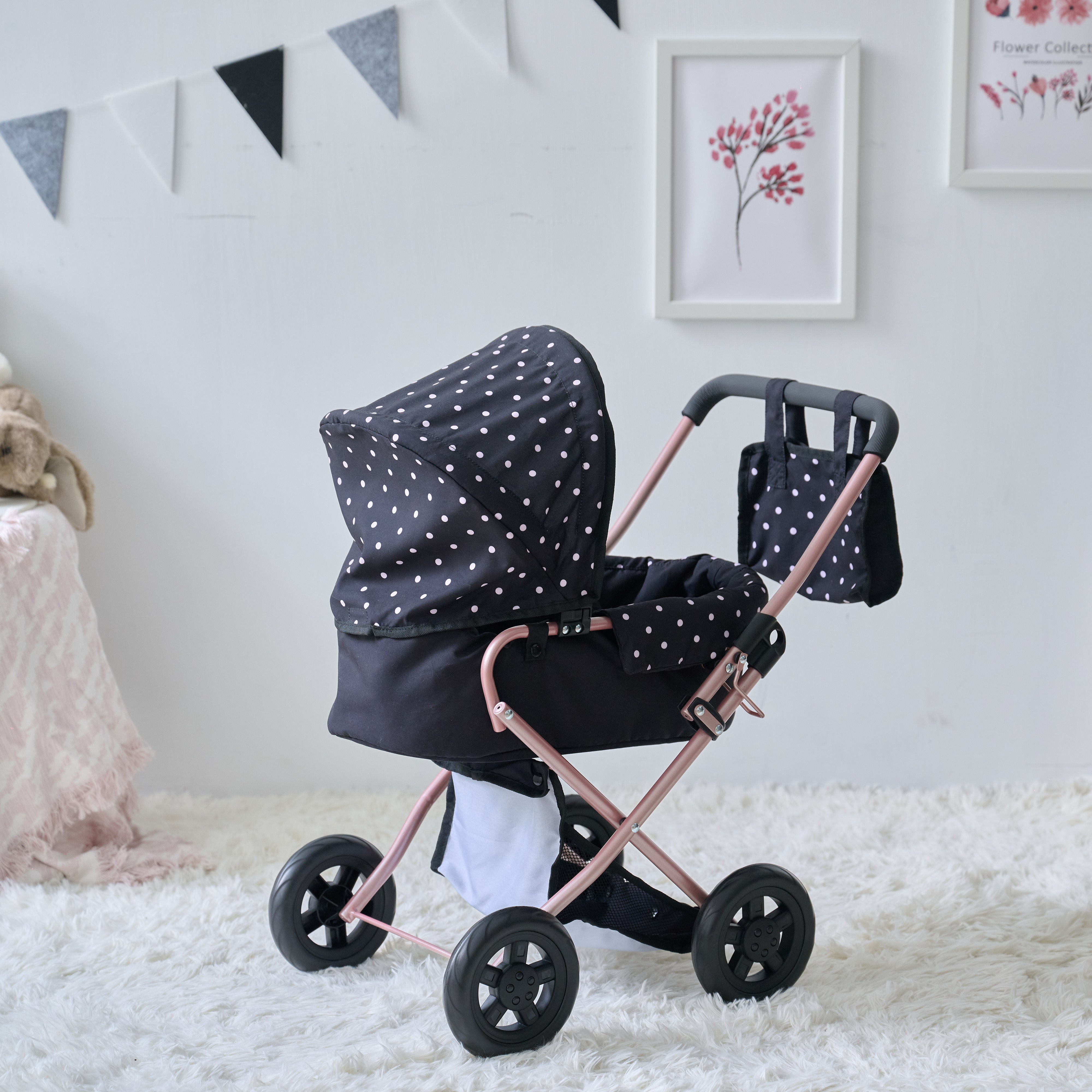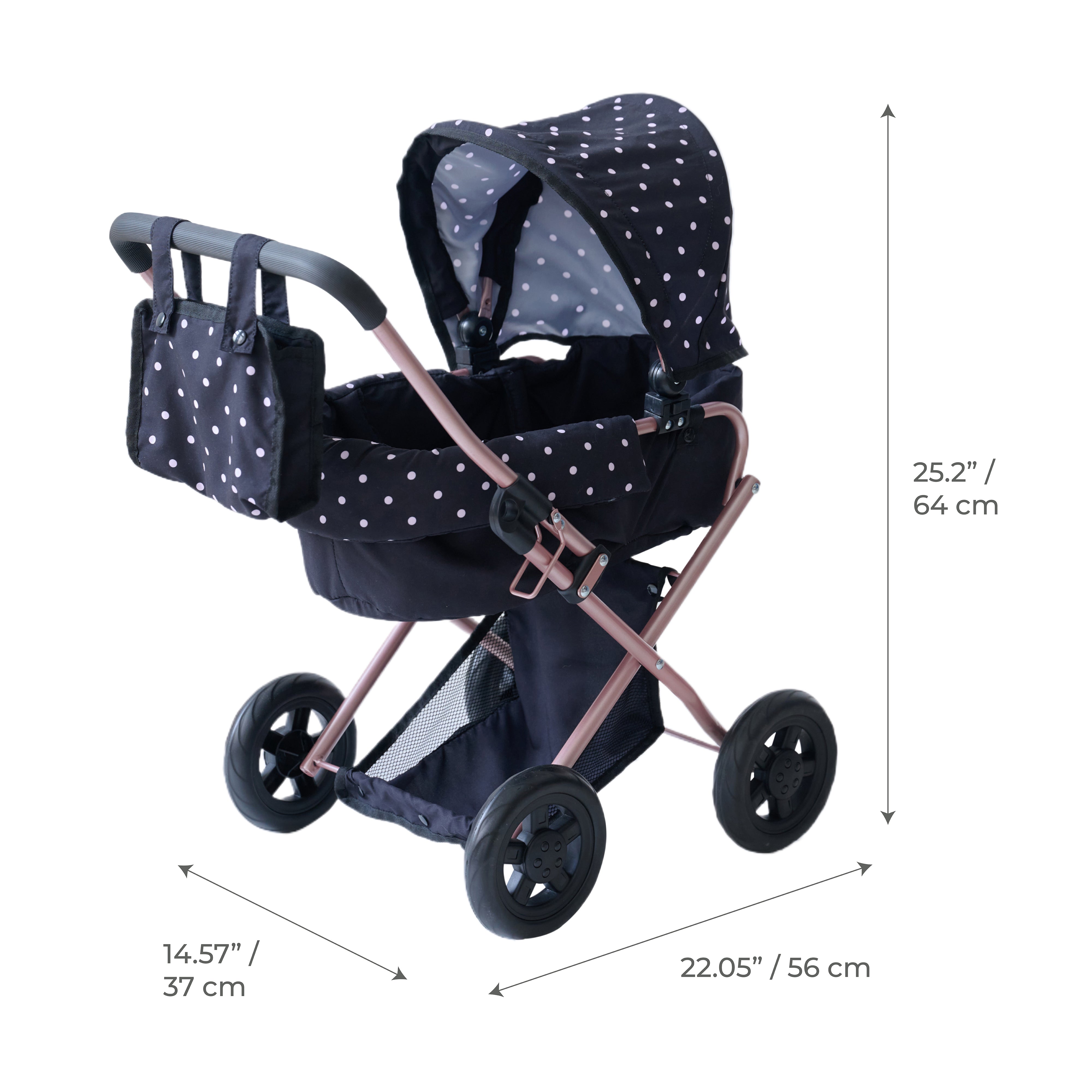 Designed with Style and Function in Mind: The retractable canopy, matching nursery bag, and soft storage basket underneath elevate the pretend play experience, while the sturdy metal frame ensures long-lasting use thtough active, daily routines.