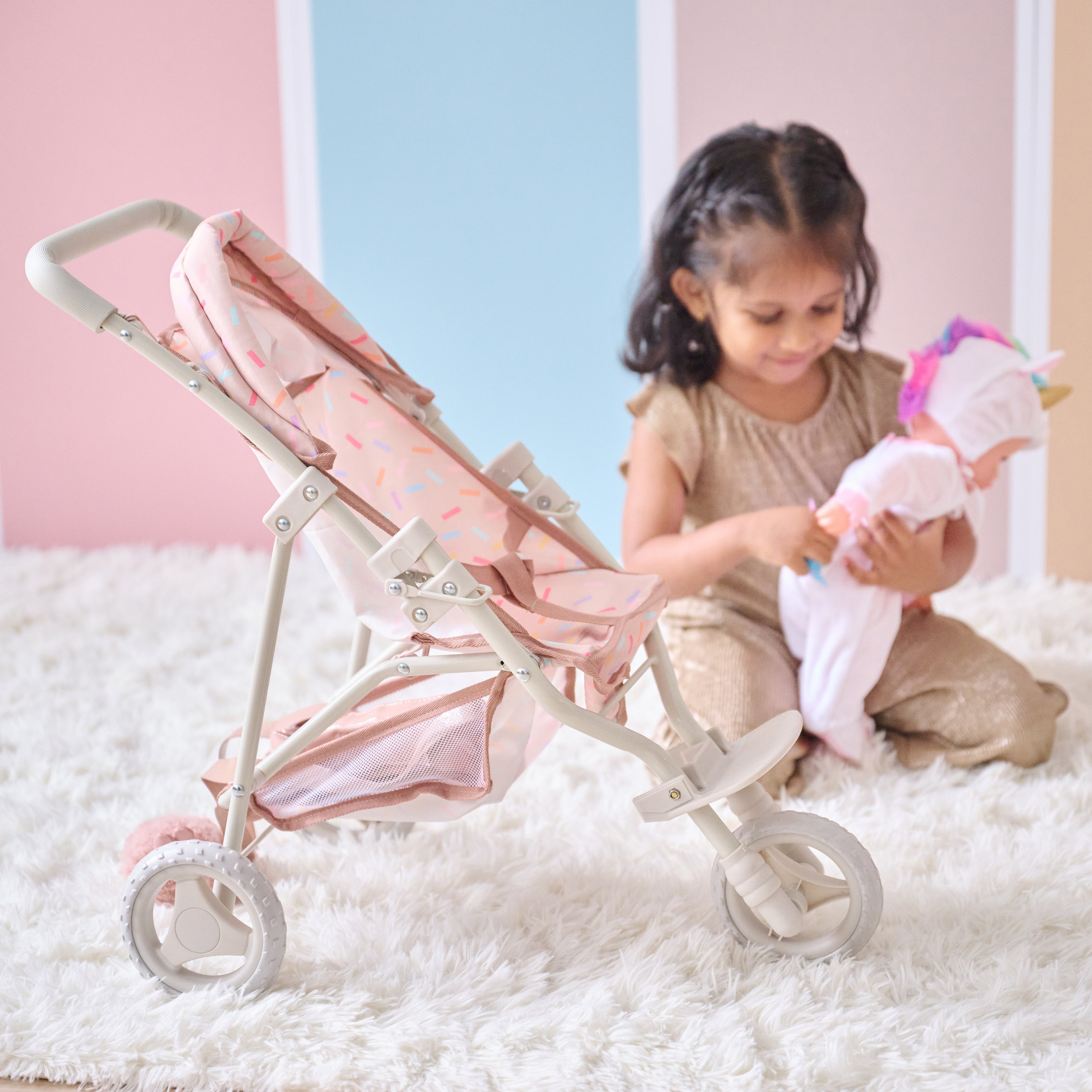Let your child take the lead with a baby doll stroller made just for them. This beige doll stroller with rainbow confetti pattern combines a playful design with real-function features that encourage independent, active, and screen-free play.