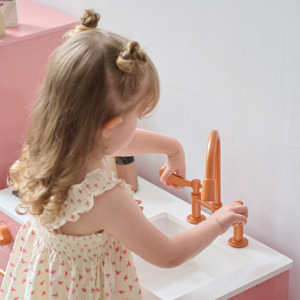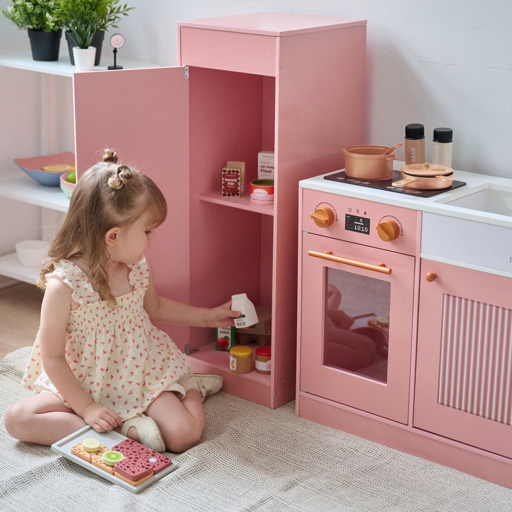 Let your little chef take the lead with this modern wooden play kitchen—designed not just for style, but for meaningful, hands-on play. This peach kids kitchen playset sparks imagination, builds confidence, and supports key developmental skills, all while looking beautiful in your home. From whipping up pretend meals to organizing groceries in the fridge, this toddler kitchen set gives kids the space to role-play real-life routines in their own creative way.