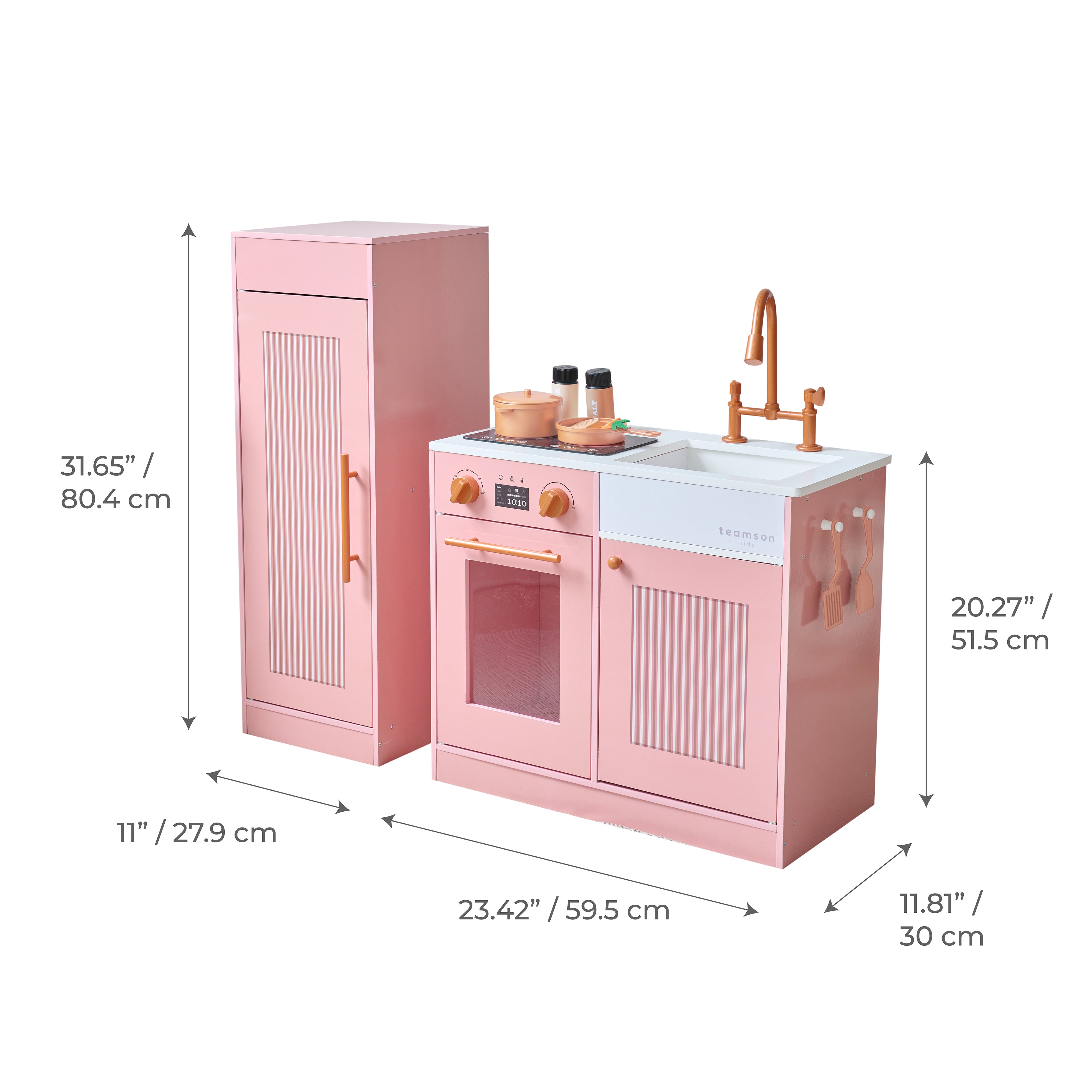 It encourages independent play, storytelling, and social interaction as they “cook,” clean, and serve—just like grown-ups do. The two-piece layout—a stovetop/sink unit and separate refrigerator—can be arranged in any space, giving children the freedom to design their own kitchen setup. Hanging hooks and storage areas help reinforce responsibility and tidiness in a way that feels fun and rewarding.