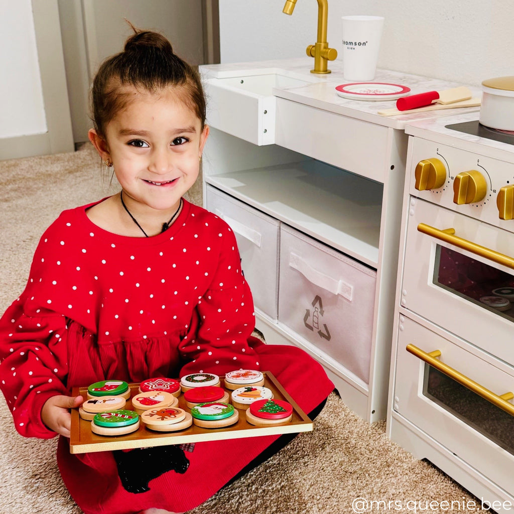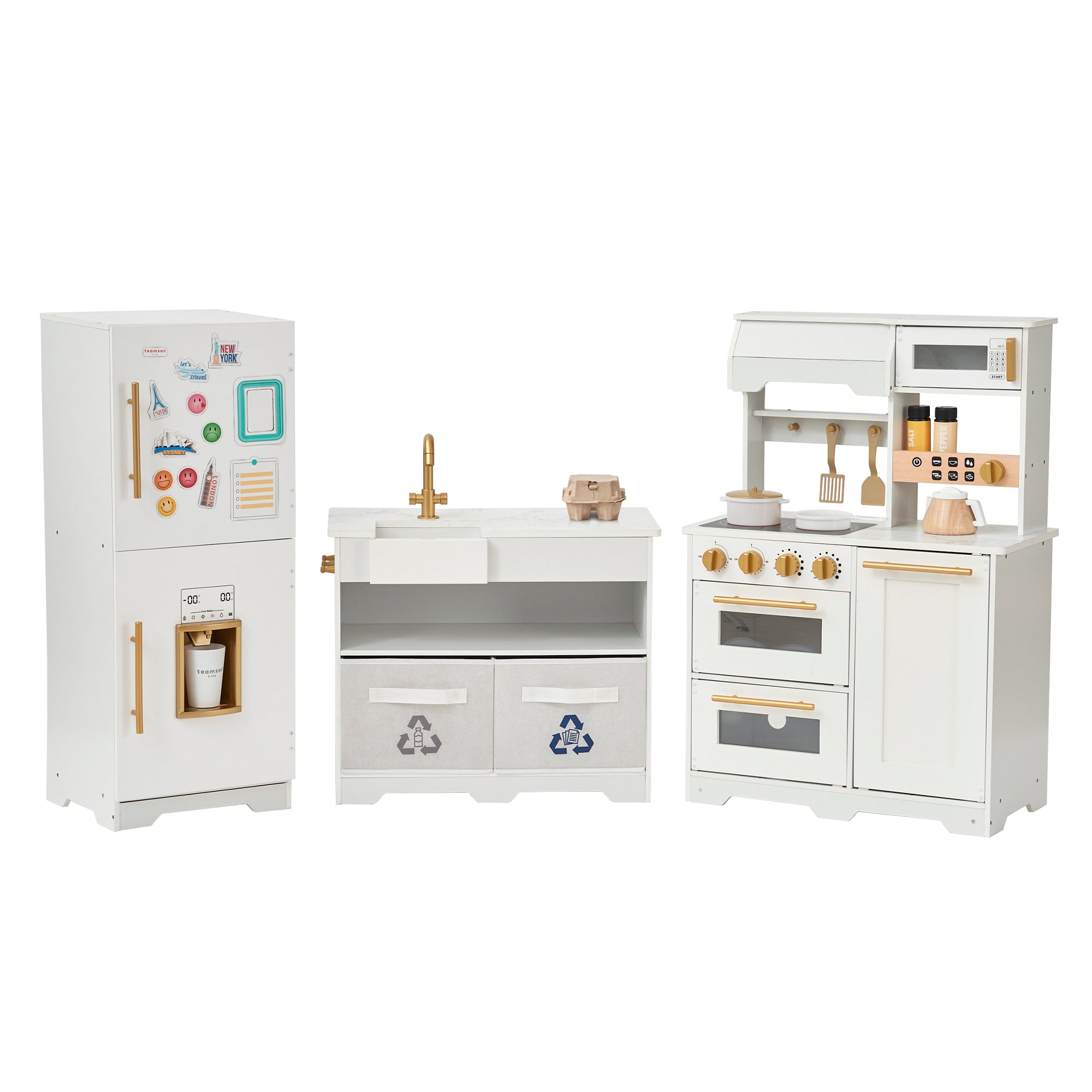Thoughtfully made for children ages 1–5, this kids kitchen playset includes three freestanding wood units that you can arrange to fit any playroom or shared space. The interactive design offers realistic play features that kids love—clicking oven knobs, a magnetic fridge door, and a working pretend icemaker that drops play cubes. It’s a toddler kitchen that turns everyday routines into role play that builds life skills. With 17 accessories included—like pots, pans, utensils, a coffee pot, and wooden eggs in a carton—this toy kitchen delivers a complete setup for immersive pretend play.