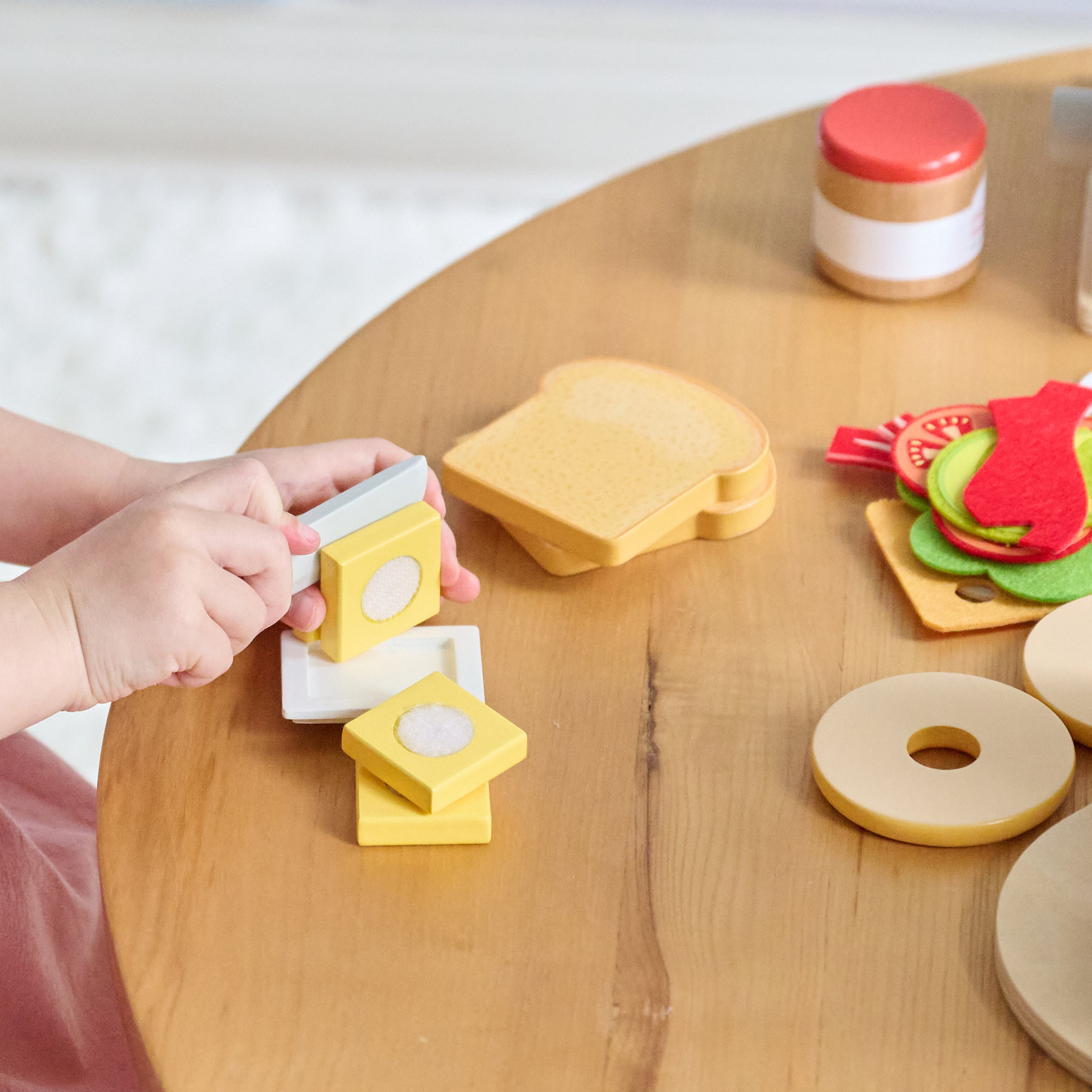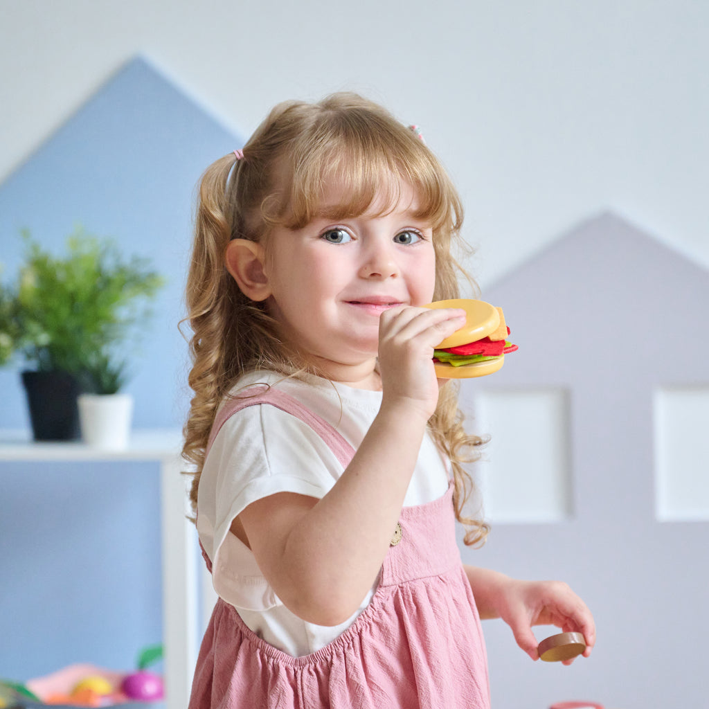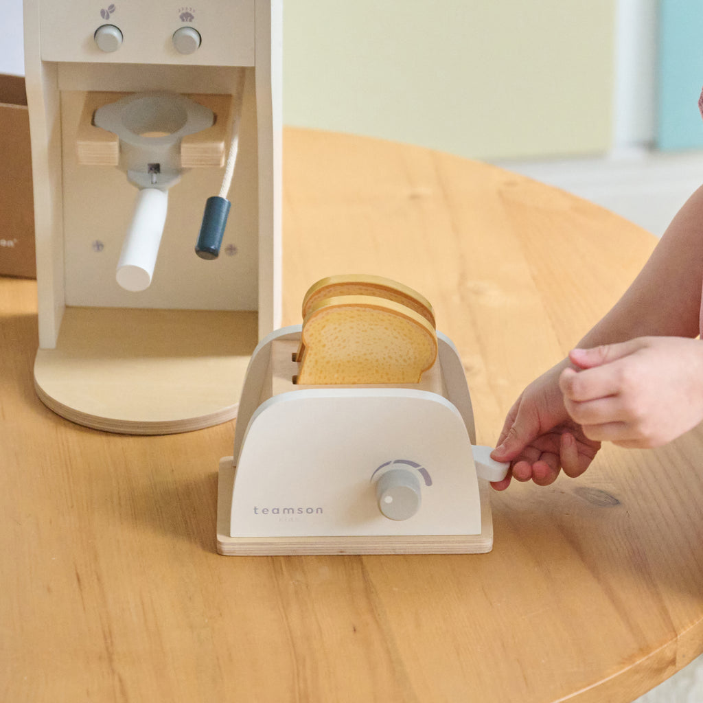 The toaster features a press-down lever, and the coffee machine includes buttons, a removable portafilter and two play coffee beans. The details make it feel real, the butter slices separate and the ingredients can be layered out. Every element invites kids to prep, serve and imagine. This set supports early independence, fine motor coordination, sequencing, and social role play. Whether they're making breakfast for a stuffed animal or packing up for preschool, kids develop confidence through familiar scenarios. With a compact layout and a fresh coconut milk white finish, this set fits beautifully into kitchens, bedrooms or Montessori playrooms. All it takes is a tabletop and a few minutes before the fun begins.